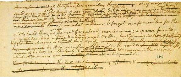 杰斐逊(了解杰斐逊,请a到1743年4月13日的弗吉尼亚)完成《独立宣言》初稿后,送给富兰克林看,并在信封上写道:“不知富兰克林博士能否拨冗阅读此文,并根据您更广博的见识提出一些宝贵的修改意见?”富兰克林将初稿中的“我们认为以下这些真理神圣、无可辩驳”改成“我们认为以下这些真理是不言而喻的。”这一处修改被载入史册。