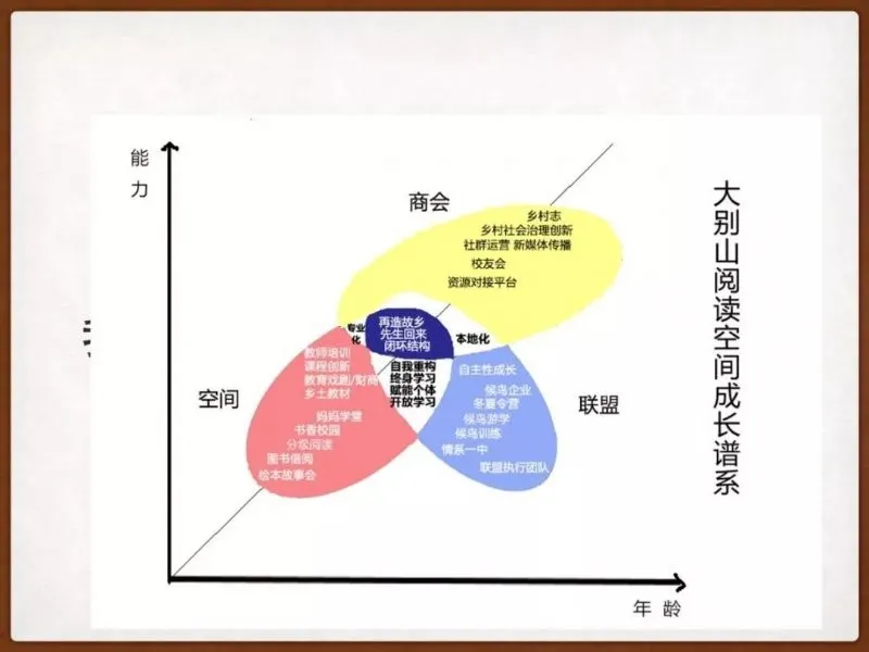 2015年6月 ,邓世杰回到英山,将已经运行半年的社群,以“英山县新一代商会”的名字在当地民政局注册社会团体。经过五年的发展,旗下的大别山阅读空间、英山人大学生联盟、英山一中校友联谊会等二级机构相继成立,一个联结当地政府、商界、学界和青年人的体系搭建了起来。