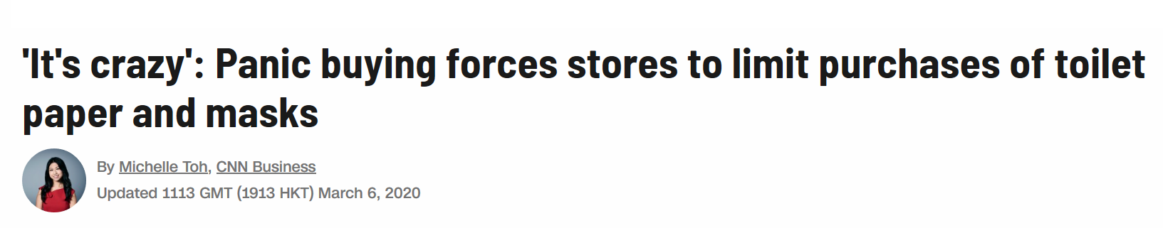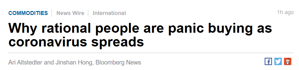 “这种情况下其实很难做到理性,因为即使你知道某件事(指疫情)将要发生,而且会持续一段时间,但你不知道它将在何时以何种程度爆发。人们只是每天被告知要提高警惕,做好防护准备。对一般人来说,还有什么比囤东西宅家更好的防护模式吗?”