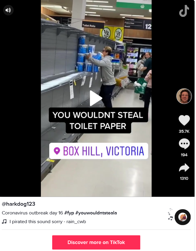许多澳洲年轻人还在tiktok(抖音国际版)上发短视频调侃这种哄抢卫生纸的行为。