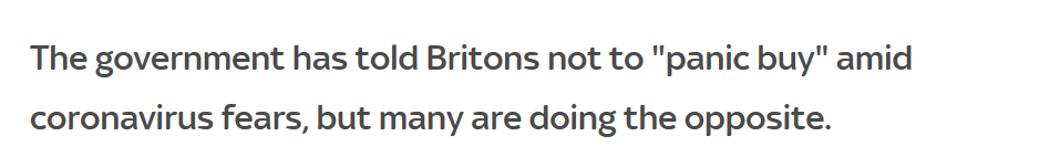 大多数报道都提到了一个词,panic(恐慌)。恐慌之下,人们丧失理智买很多当下不是那么必要的东西,这背后是强烈的生存意识。这时候不管是谁,安慰大家不要惊慌,都是没什么用的。比如英国,据Sky News报道,就算政府已经告诫民众不要因恐慌而冲动消费,但人们就是不听。澳大利亚总理莫里森也发话说,没有必要囤积厕纸,本地供应充足。但目前还没有起到很好的安抚人心的效果。