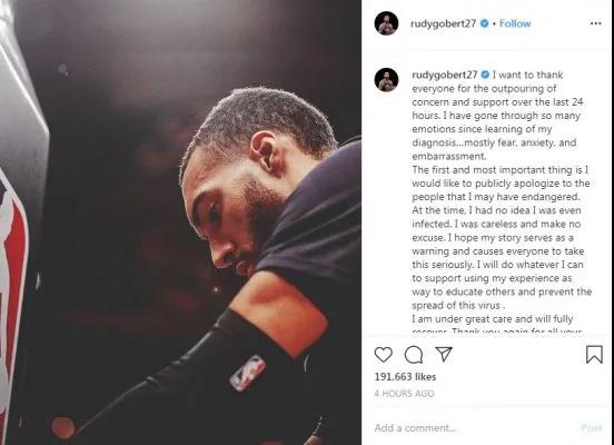 NBA不得不临时中止赛事。确诊后,戈贝尔在ins中提到,他感到恐惧、焦虑、羞愧,并对可能被其危及的人道歉。