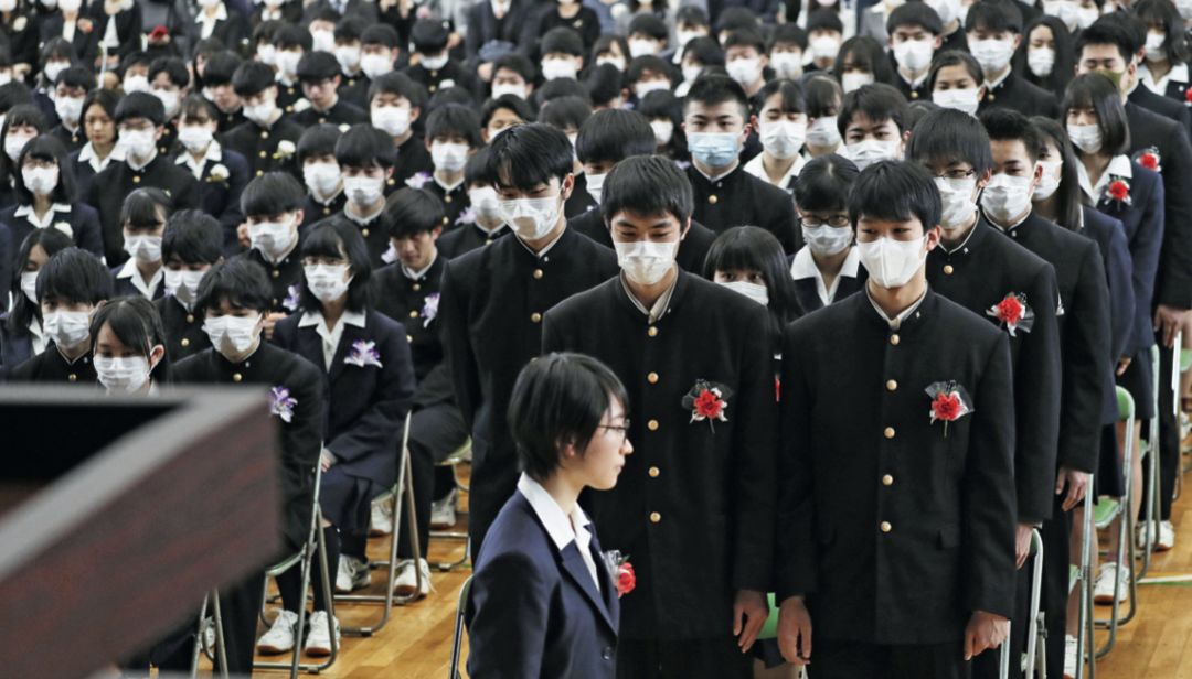 3月2日,在日本名古屋的一所高中,学生们戴着口罩参加毕业典礼。