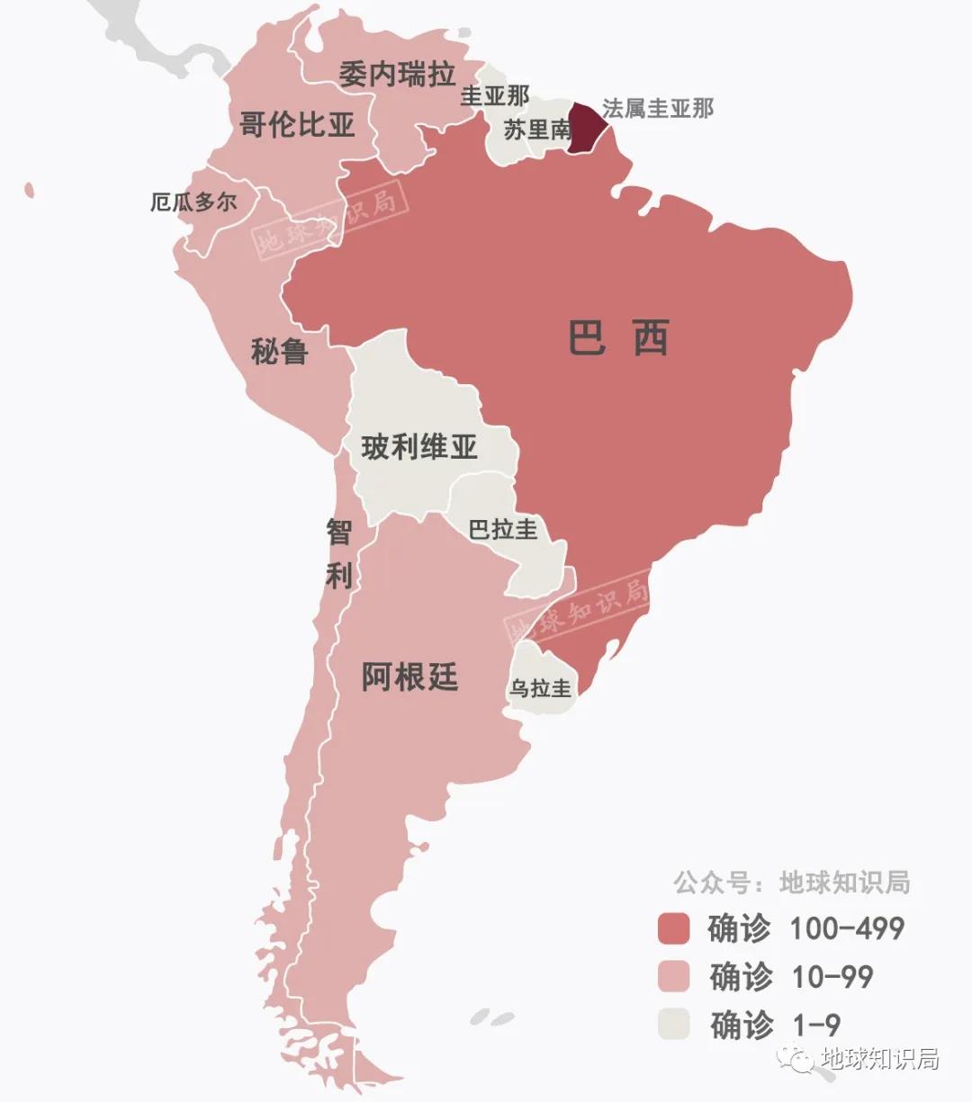 其余南美国家,从目前确诊数字来看情况相对好些,都不超过30例。