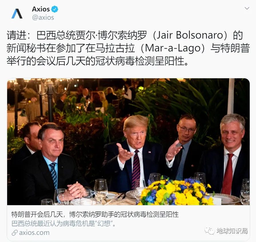 除了普通民众外,巴西也有政府高员感染。巴西驻美大使福斯特上周与巴西总统博索纳罗一同会见了特朗普,还与特朗普共进了晚餐,而该官员之后被证明是同行人员中确诊的第四人,与他同上过饭桌的特朗普则深信自己不会被病毒感染。