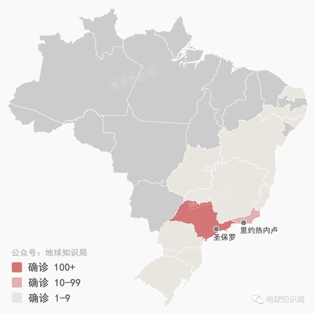 目前巴西的确诊病例集中在圣保罗州和里约热内卢州