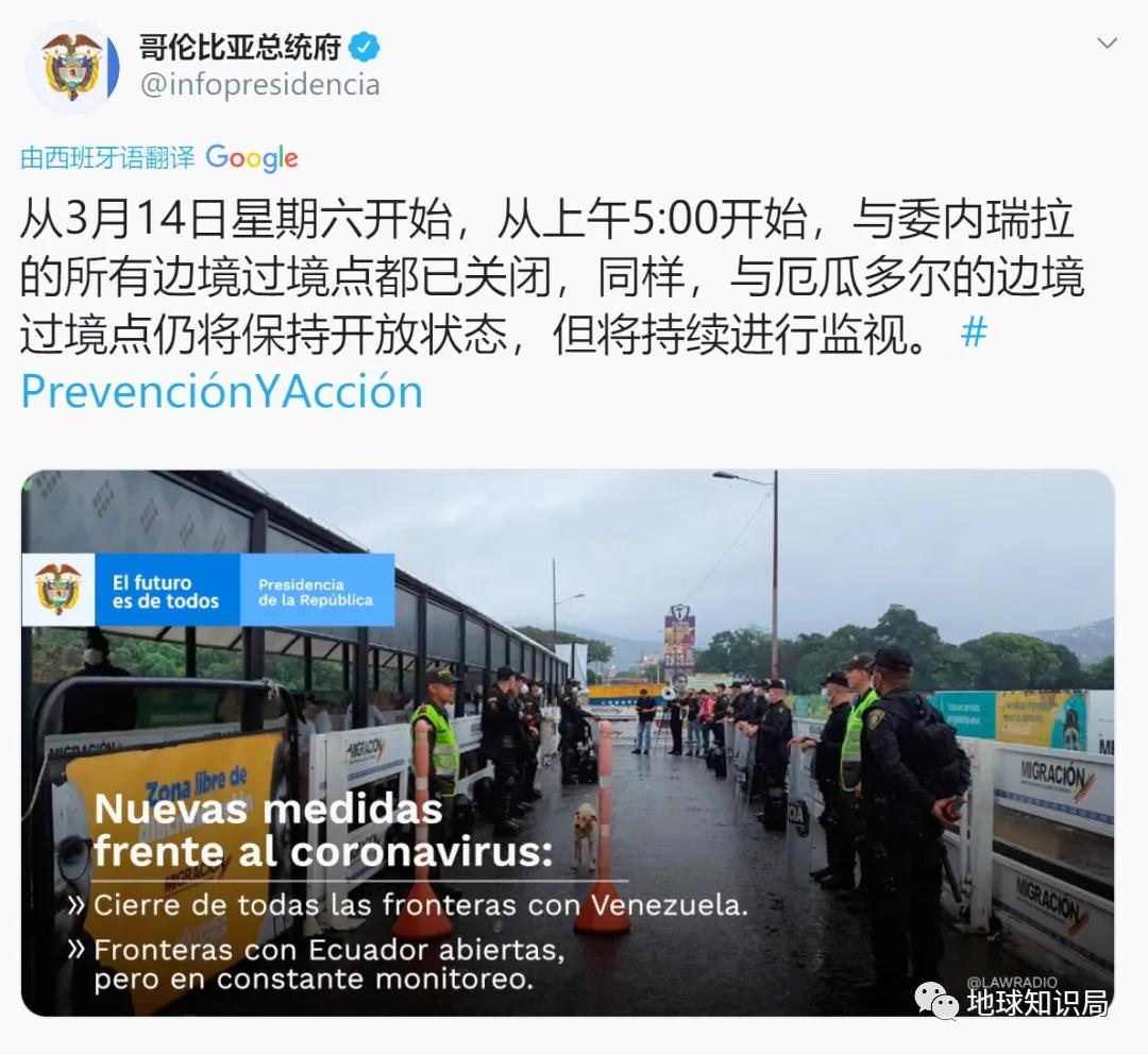 哥伦比亚,采取的措施更严格。它先是要求来自法国、西班牙、意大利和中国的人员,在入境哥伦比亚后进行两周的自我隔离,又在3月12日宣布进入卫生紧急状态,并下令暂停超过500人的公共集会,包括足球比赛,并禁止邮轮在该国港口靠泊;3月13日,总统伊万杜克宣布将关闭与邻国委内瑞拉的边境。