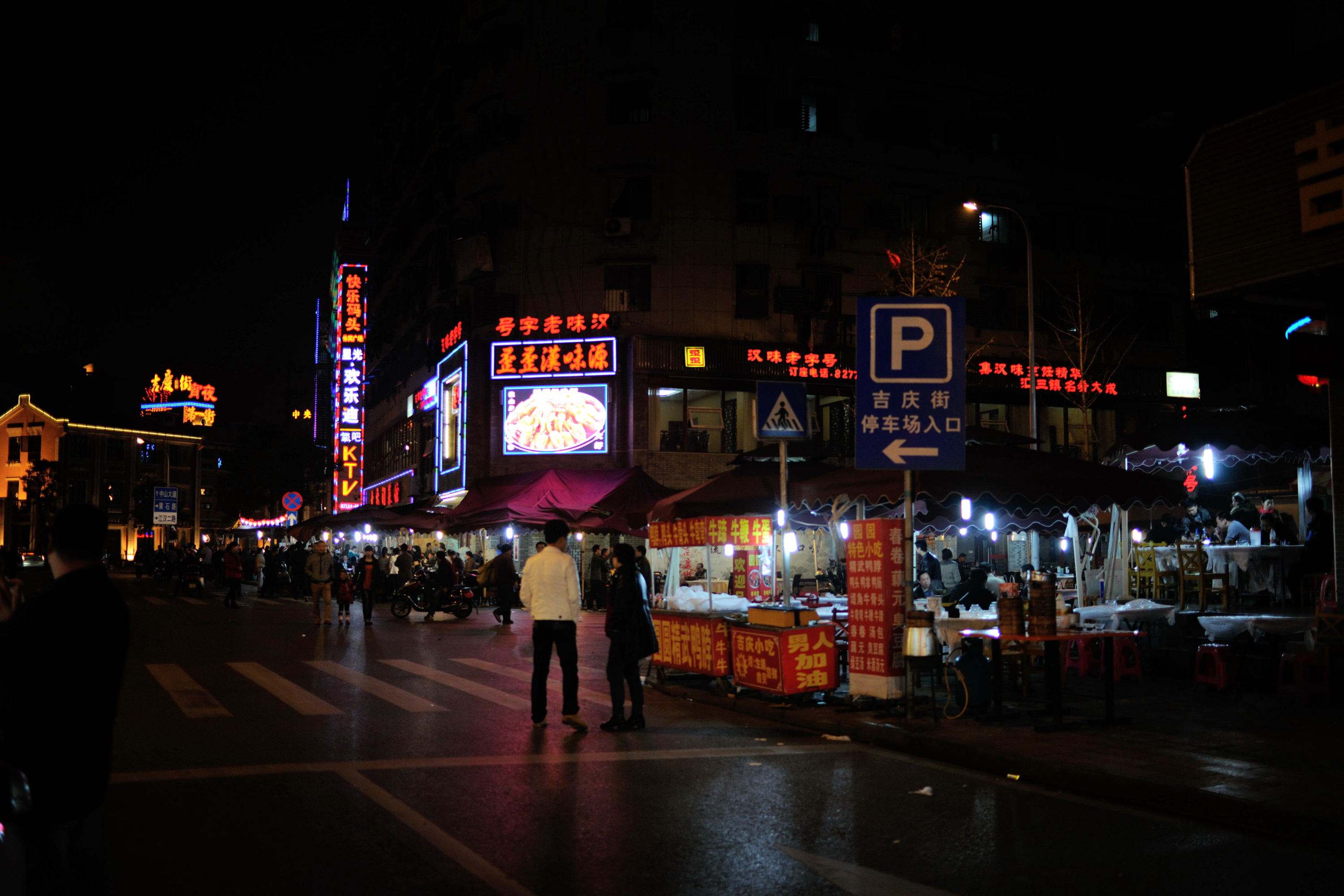汉口有一条很有名的街叫吉庆街,因为整条街上都是大排档,路面上黏了一层油,如果你穿了一双胶底鞋,走在上面会一粘一粘的。吉庆街两边常年坐满了吃饭的人,街头艺人会在其中穿插表演,有吹拉弹唱的,也有演相声小品的。这里没有舞台,也没有剧场和餐厅的界限,这就是所谓的“浸入式戏剧”吧,吃着吃着饭,忽然跳出一个人,就在你桌子旁边演起来了。