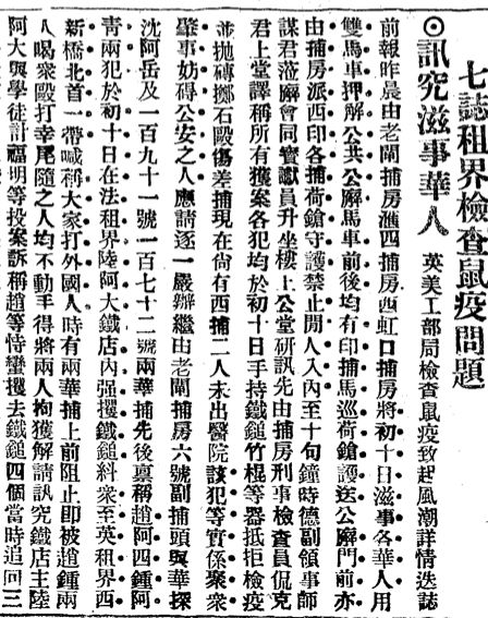 工部局派人查验鼠疫,自是出于慎重民生起见,只是须先期将鼠疫如何凶险以及查验的具体办法一一明白晓示,才可使租界居民不致误会。听说本月十四号工部局会讨论此事,希望不操之过急,查验的方法必须简单易行,不可稍涉纷扰。我们愿见中外居民共享和平之福。