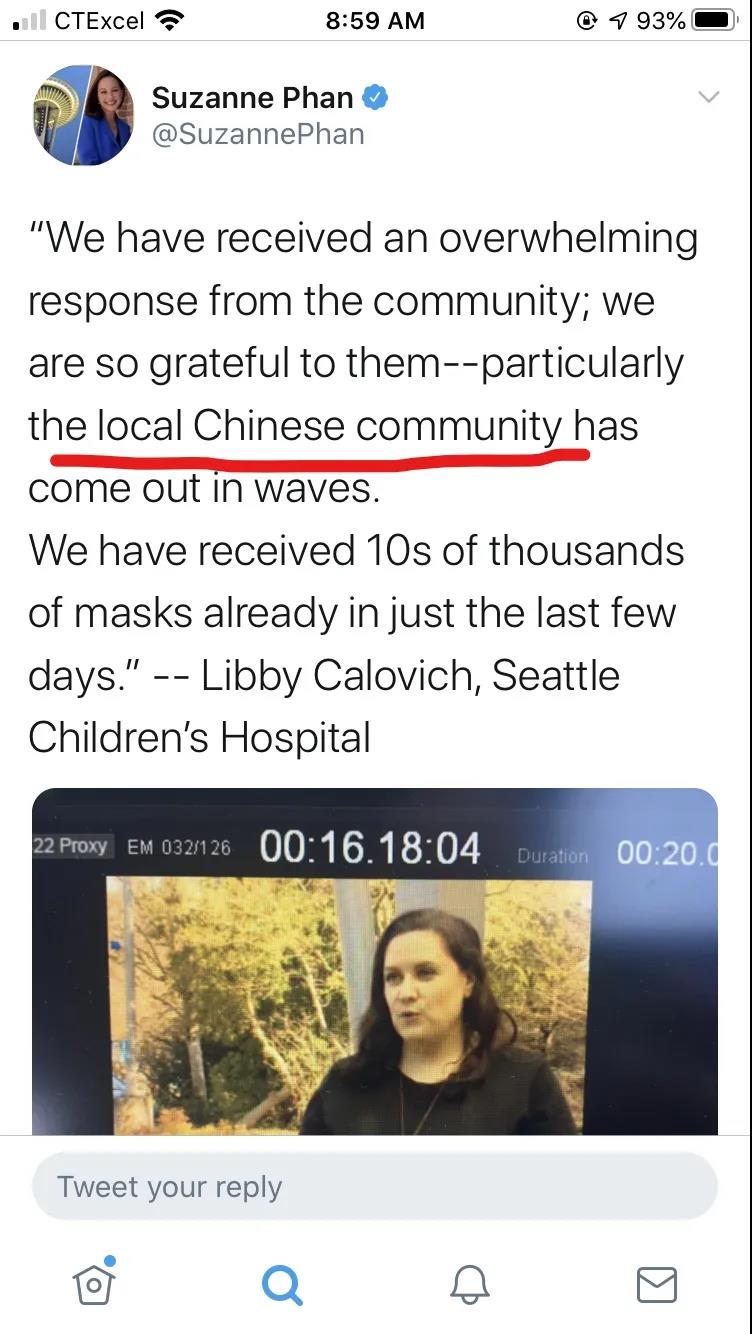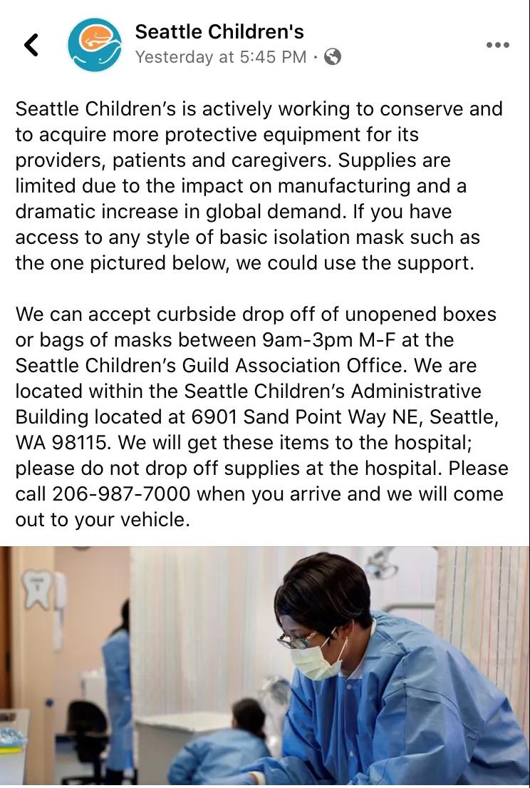 西雅图儿童医院在Facebook上发出了公开求助信,接受医护用品的支援。他们的呼吁得到了社区,尤其是当地华人社区的热烈回馈。“在几天内就收到了数万只口罩。”