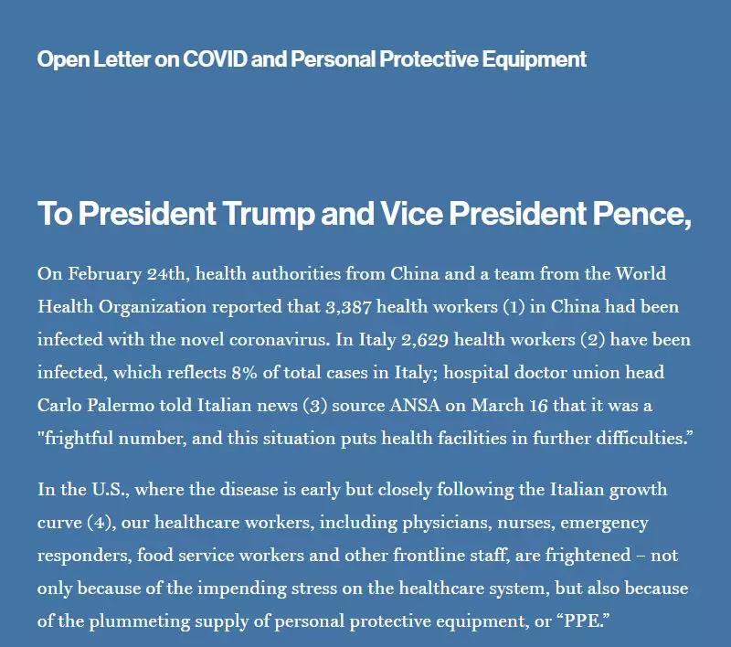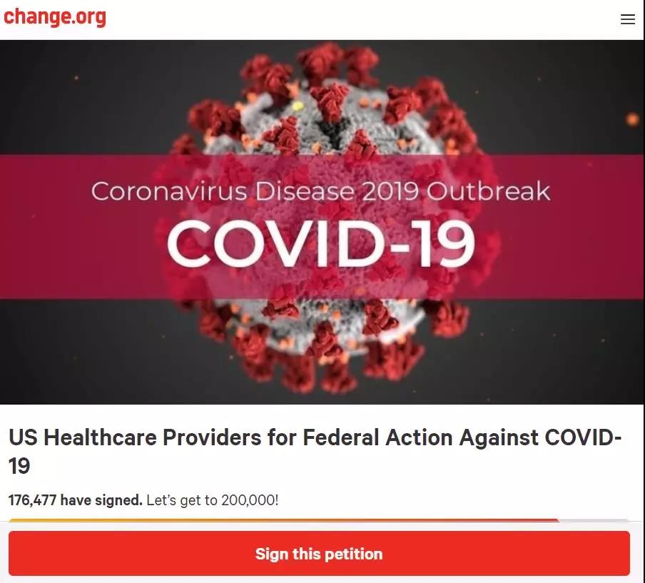 包括医师,医师助理,护士和麻醉师在内的美国医护人员公开发起公开信,向美国总统特朗普,彭斯副总统和议员们紧急要求采取三项行动,并号召20万人联署。