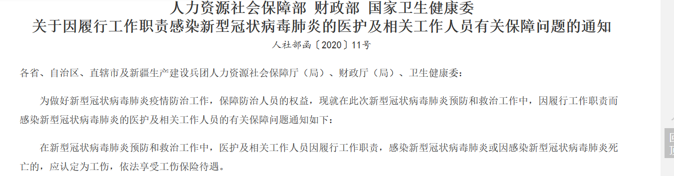 早在1月23日,人社部、财政部、国家卫健委就联合发文明确,在新型冠状病毒肺炎疫情防控和救治工作中,医护及相关工作人员因履行工作职责感染新型冠状病毒肺炎的,应认定为工伤,依法享受工伤保险待遇。