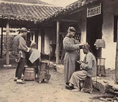 随着清朝推行“剃发易服”的政策,出现了“剃头”这一行当,进而形成了剃头担、剃头店、剃头房等从业模式。北京的剃头业还有着自己的行会,其会馆称“挑行会馆”,制定行规,连络着北京城近一千多家剃头房。