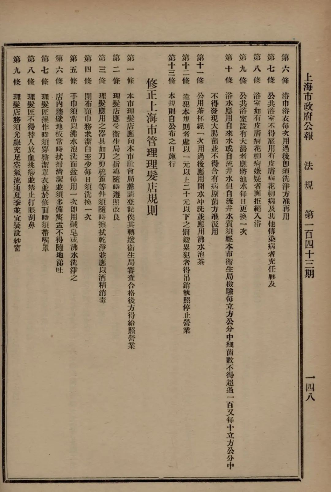 针对理发店存在的卫生问题,上海特别市政府则于1930年1月率先制定出《卫生局管理理发店规则》,并报卫生部备案。这个地方卫生单行章开了彼时专门治理理发行业卫生状况的政策先河。此规则共分11条: