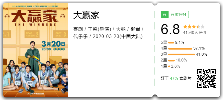 3月22日,《大赢家》网络播出第3天,豆瓣评分6.8分,4万多名网友打分。口碑超过之前网络首映的《囧妈》《肥龙过江》。