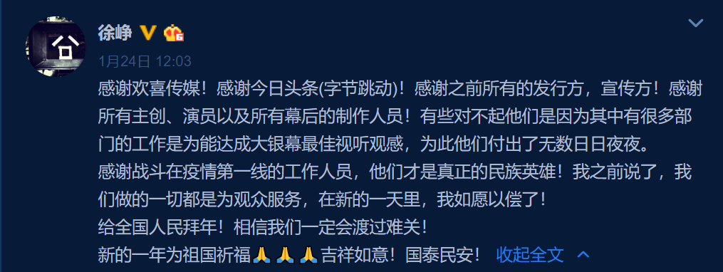徐峥的个人微博的更新也停留在这一天。他在微博中表达了对于电影不能在影院放映的惋惜:“感谢所有主创、演员以及所有幕后的制作人员!有些对不起他们是因为其中有很多部门的工作是为能达成大银幕最佳视听观感,为此他们付出了无数日日夜夜。”