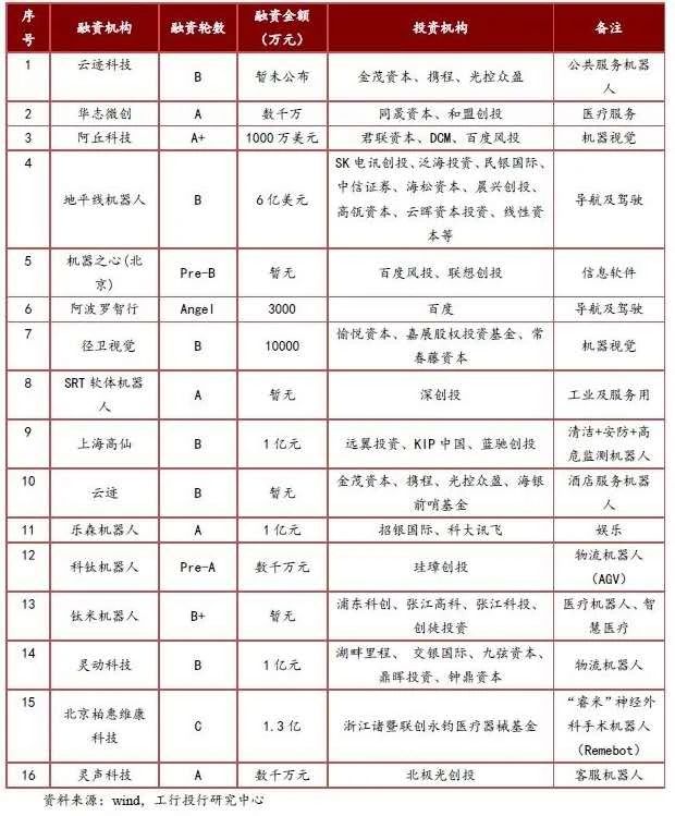 而在融资方面,据工银投行分析师分析,目前服务机器人融资主要集中在具有原创性和出货量稳定增长的领域,比如物流机器人(AGV)、安防机器人、救援机器人、机器视觉技术等。