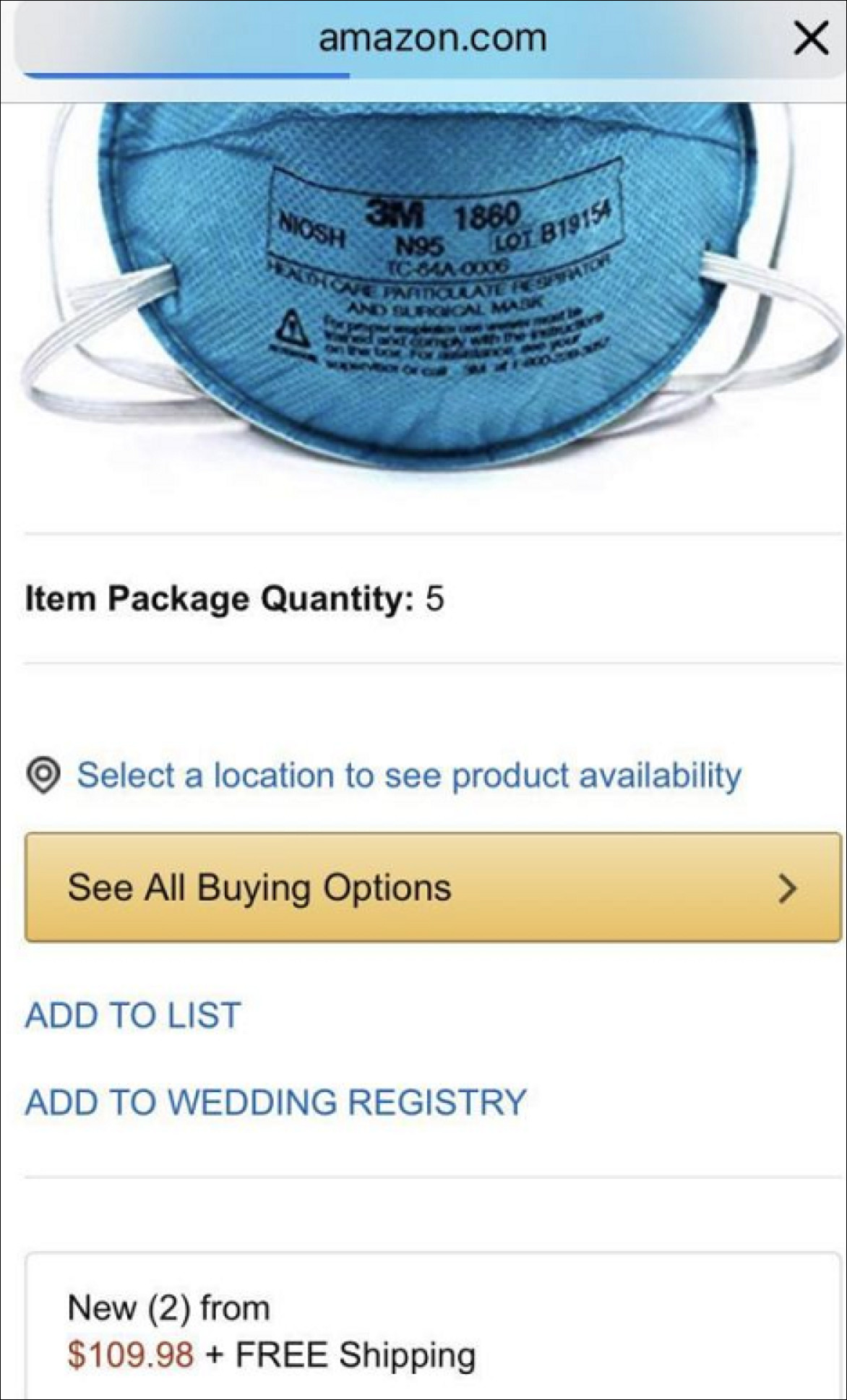 近日亚马逊上五只口罩售价已经涨至110美元,图片来自网络