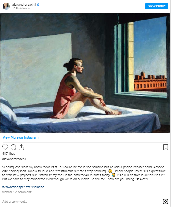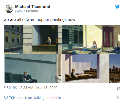 总之,霍珀的画告诉我们,虽然坐在家里毫无用处,但就目前而言,我们能做的最好的事情就是和他人“保持距离”,勤洗手,并且保持情绪稳定。