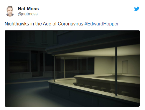 快进近80年,推特上的用户认为下面这张图片准确地描述了冠状病毒时代的“夜鹰”。它证实了2020年3月的生活比二战中期的美国更加暗淡。
