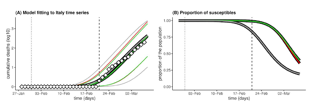 左图为不同情景下,模型模拟的意大利新冠肺炎死亡增长曲线与报告的累计死亡病例数的吻合情况;右图为模型模拟的不同情景下,意大利容易被新冠病毒感染人群的比例随时间的变化