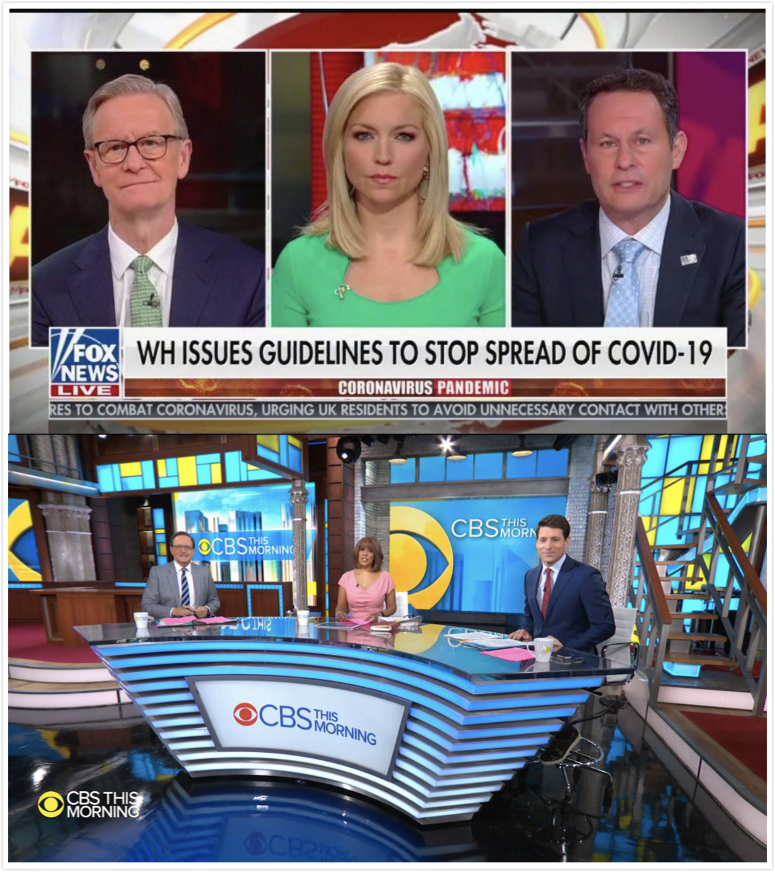 上图为疫情期间Fox的新闻播报;下图是正常情况下CBS的新闻播报