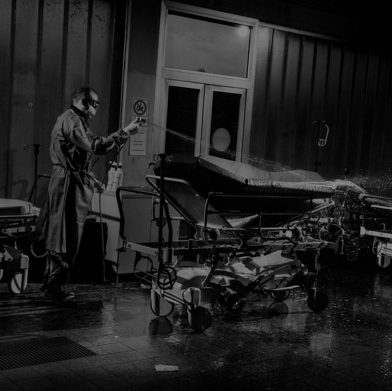 (在北部城市雷吉奥·埃米利亚的一个急诊室,一名护理人员喷洒了病床,该城市也是该流行病肆虐最严重的地区)