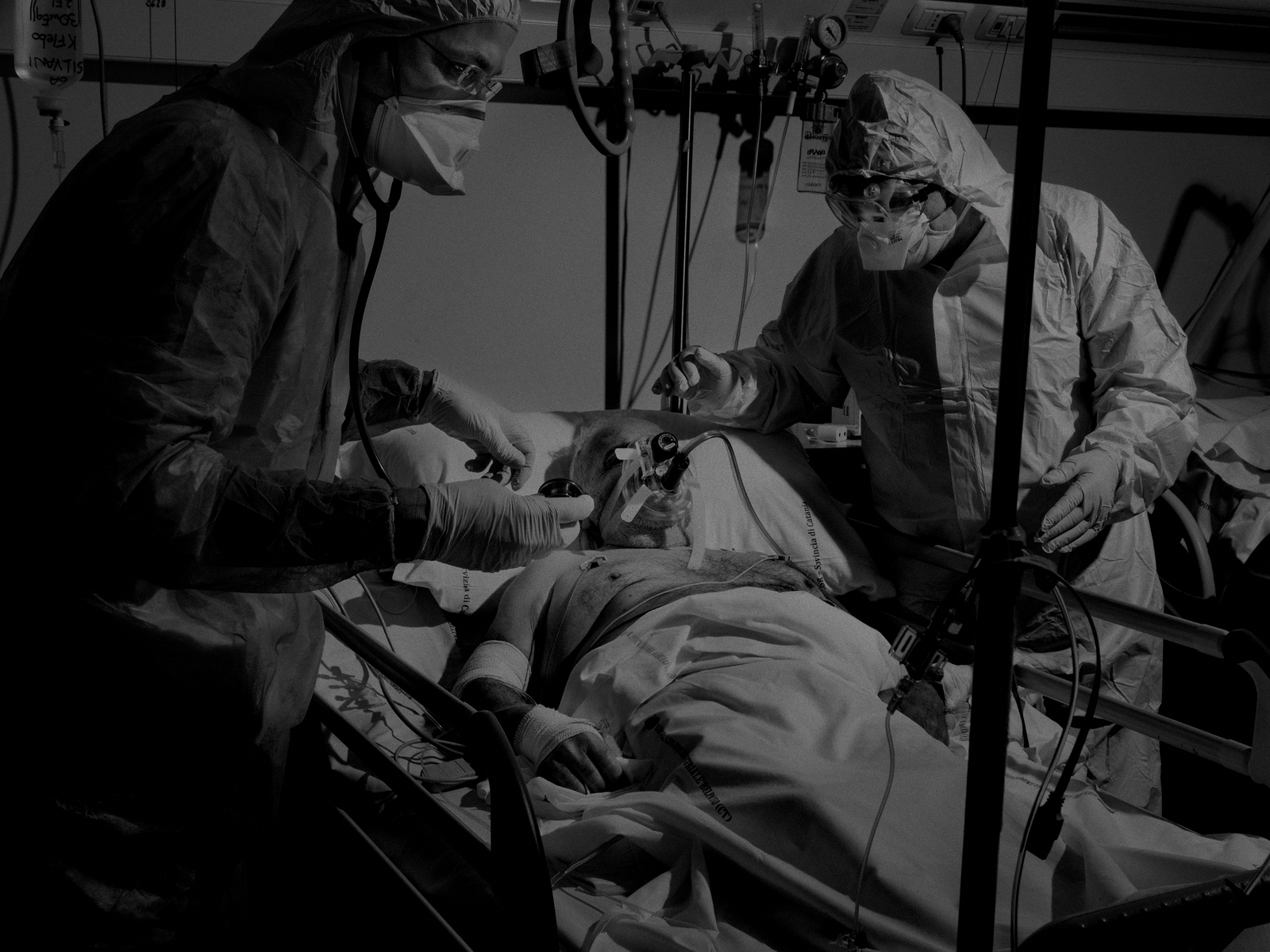 在西西里卡塔尼亚医院的重症监护病房里,感染病毒的老人在呼吸机的帮助下保持呼吸