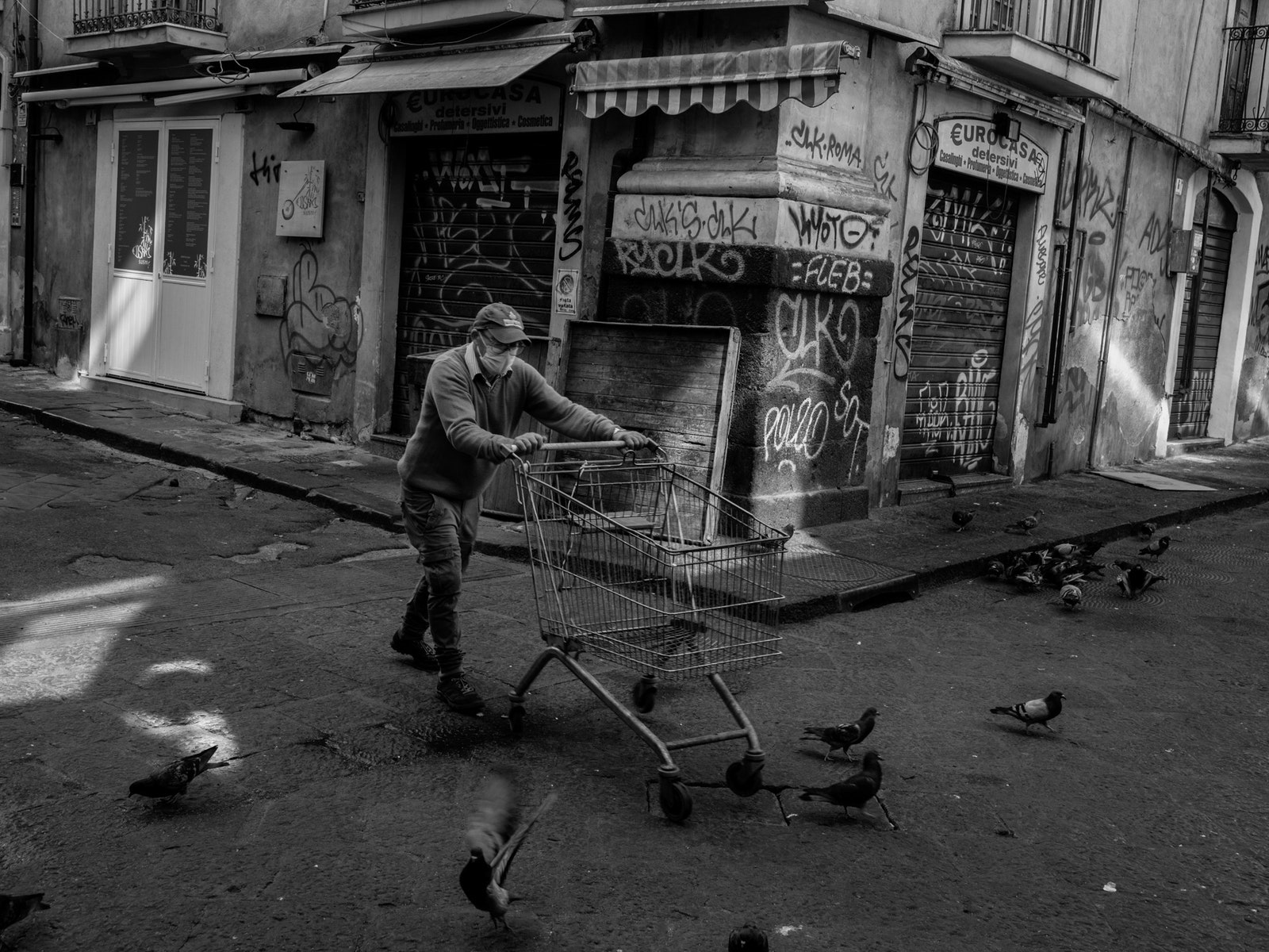 在卡塔尼亚,一个人看似漫无目的地推着购物车,自言自语。马乔利觉得这种画面充满了“末世感”