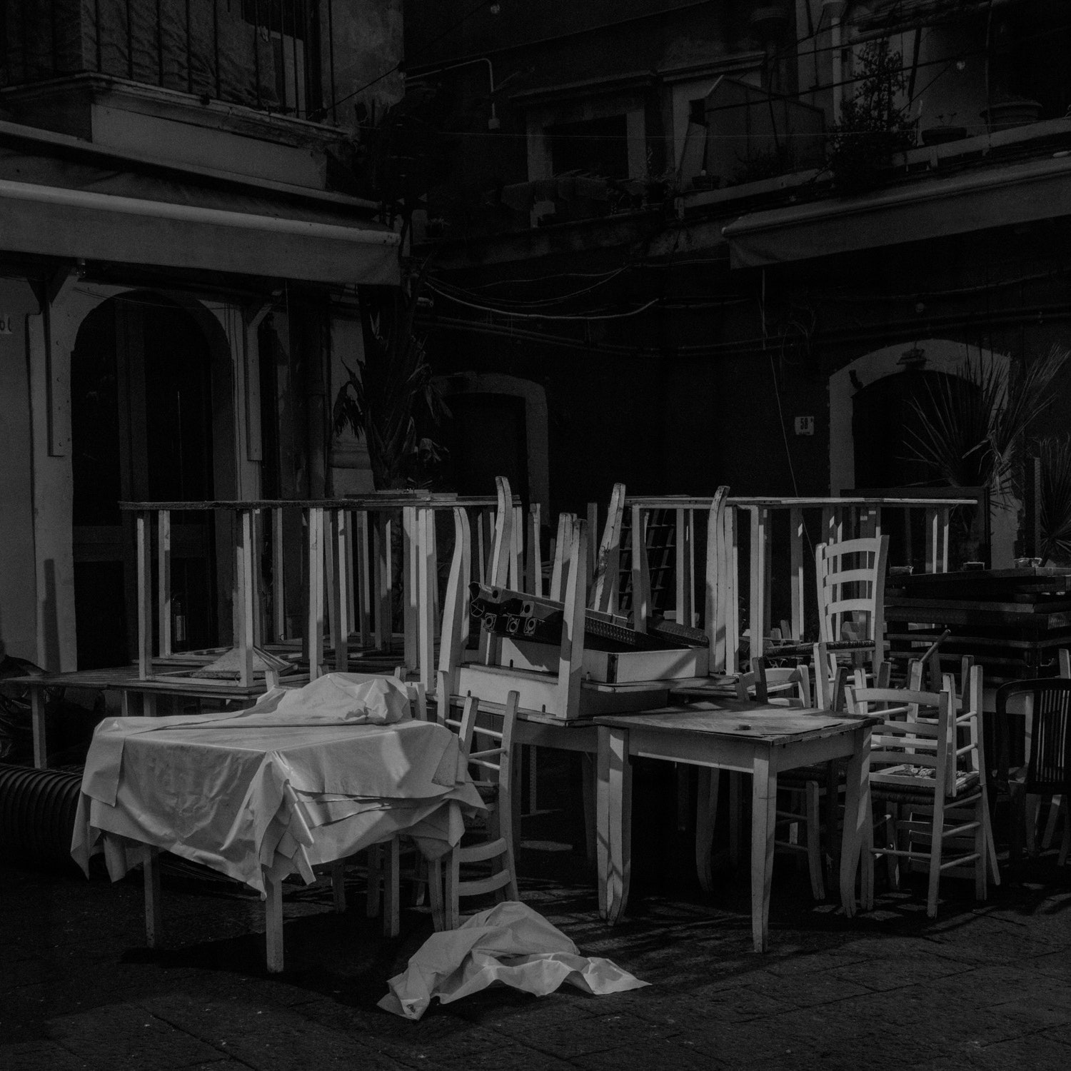 在卡塔尼亚的一个小公共广场上,杂乱的桌子和椅子传达了员工们不得不关闭餐厅前的匆忙
