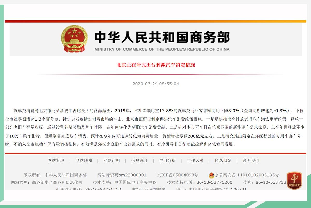 3月24日,商务部网站上发布了一条消息,称北京市正研究制定促进汽车消费政策措施:推出高排放老旧汽车淘汰更新政策,通过设置补贴奖励及购车时限,在年内转化为新购汽车消费贡献;对本市无车且在轮候范围内的家庭一次性释放不少于10万个新能源指标;研究推出限定在郊区行驶的专用小客车号牌,不纳入全市机动车保有量调控指标。