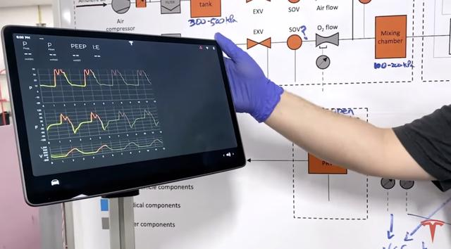 在展示了原型机之后,特斯拉的工程师还展示了这款原型机组装完成之后的完全形态版本,这款呼吸机和其他专业呼吸机相比,有很多特别的地方,例如其自动化系统是由Model 3信息娱乐系统提供支持,显示屏则是直接使用了Model 3的中控屏。