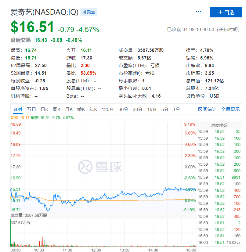然而在大盘上涨的背景下,爱奇艺、好未来、跟谁学三家中概股公司股价却还在猛跌,分别收跌4.57%、6.74%和6.10%,最高跌幅均达到了8%以上。