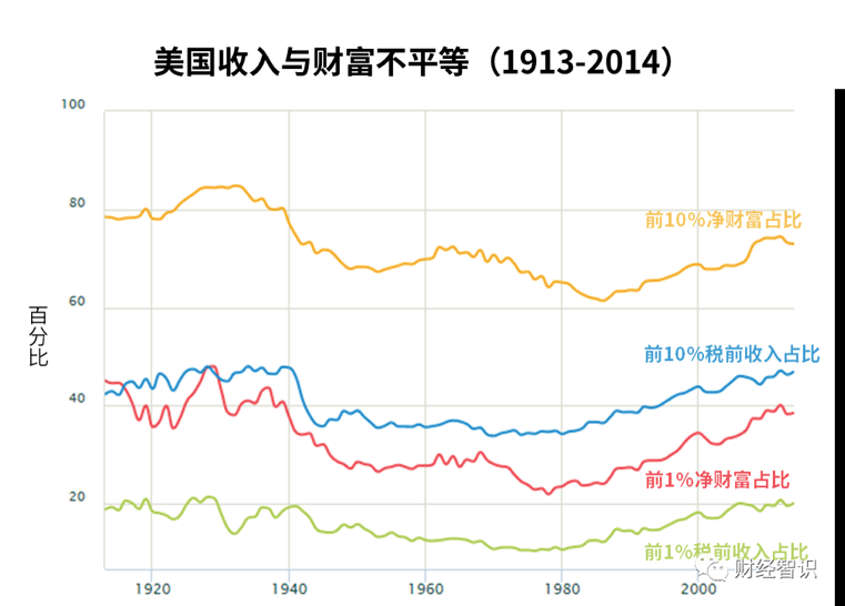然而不幸的是,全球收入和财富差距也在战后重新抬头,其负面作用已经发展到了今天令人担忧的程度。2014年,美国前1%的家庭税前收入占国民收入比重的20%,而前1%的家庭净财富占国民财富的40%,这些比重都回到了一战开始前的水平。而美国后50%的家庭收入占比约为12%,至于财富占比,则是零。