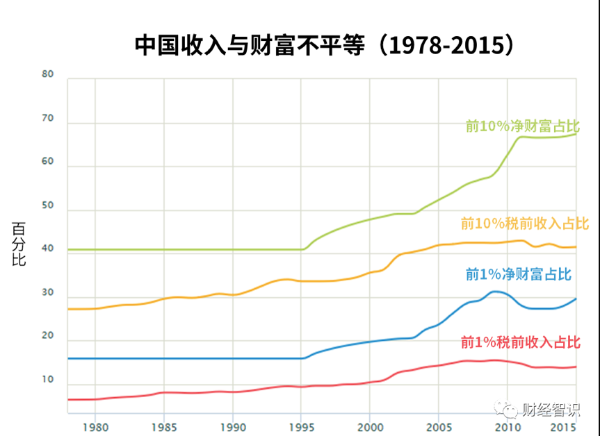 中国的收入和贫富差距在改革开放之后逐年扩大,尽管国家统计局公开的收入基尼系数从2008年的0.491持续下降到2015年的0.462后,又以上升趋势增加到2018年的0.468,但其他来源的数据显示中国的不平等程度逐年扩大,而且和美国的距离越来越靠近。
