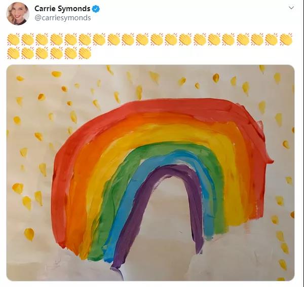得知约翰逊离开重症监护室的消息后,他的未婚妻、怀孕在身的卡丽·西蒙兹(Carrie Symonds)立即在推特上发贴祝贺。她一口气发了26个鼓掌的表情,并配上一副彩虹画。