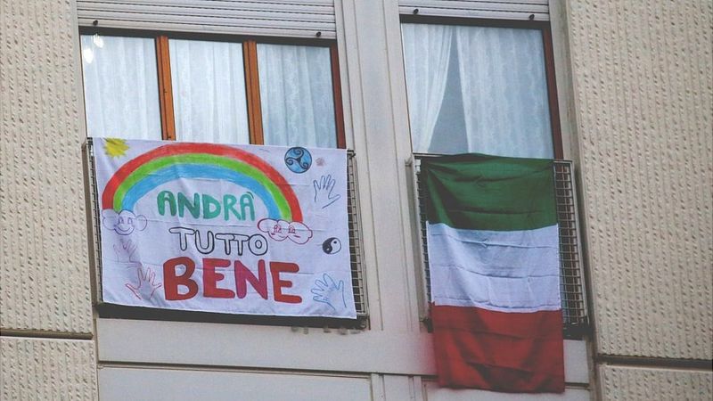 疫情期间最早的彩虹出现在意大利。随着全境封锁,意大利各地的阳台和窗户上开始出现手绘彩虹,一些彩虹下方写着“Tutto andra' bene”,即“一切都会好起来的”。