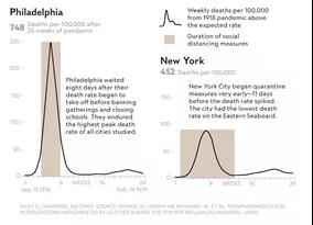 比方说在1918年9月17日,费城发现了首例快速传播的流感病毒。尽管如此,10天后,这座城市还是举办了一场有20多万人参加的游行。仅一个月,病例就上升到2万多例。相比之下,纽约市很快就采取了强制隔离和错峰营业等应对措施。结果,1919年纽约市的死亡率是所有东海岸州中最低的。