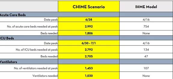 两个模型相差悬殊,所以该市的作法是做两手准备。既在为4月的高峰准备额外的病床,但也在为CHIME所描绘出的更可怕的结果做出最坏的打算。