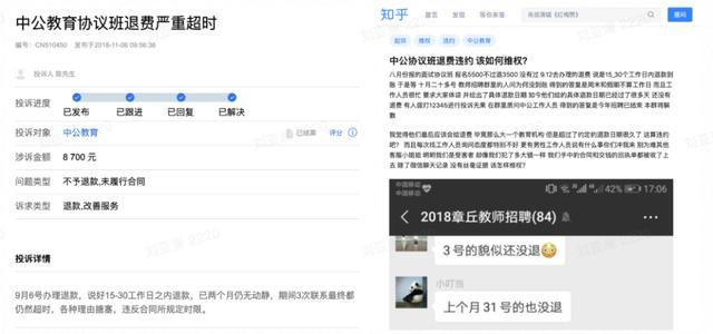 与大股东资金落袋形成鲜明对比的是,中公教育在协议班退款方面屡遭延时投诉,而中公教育的直接竞争对手承诺退款超时可投诉。
