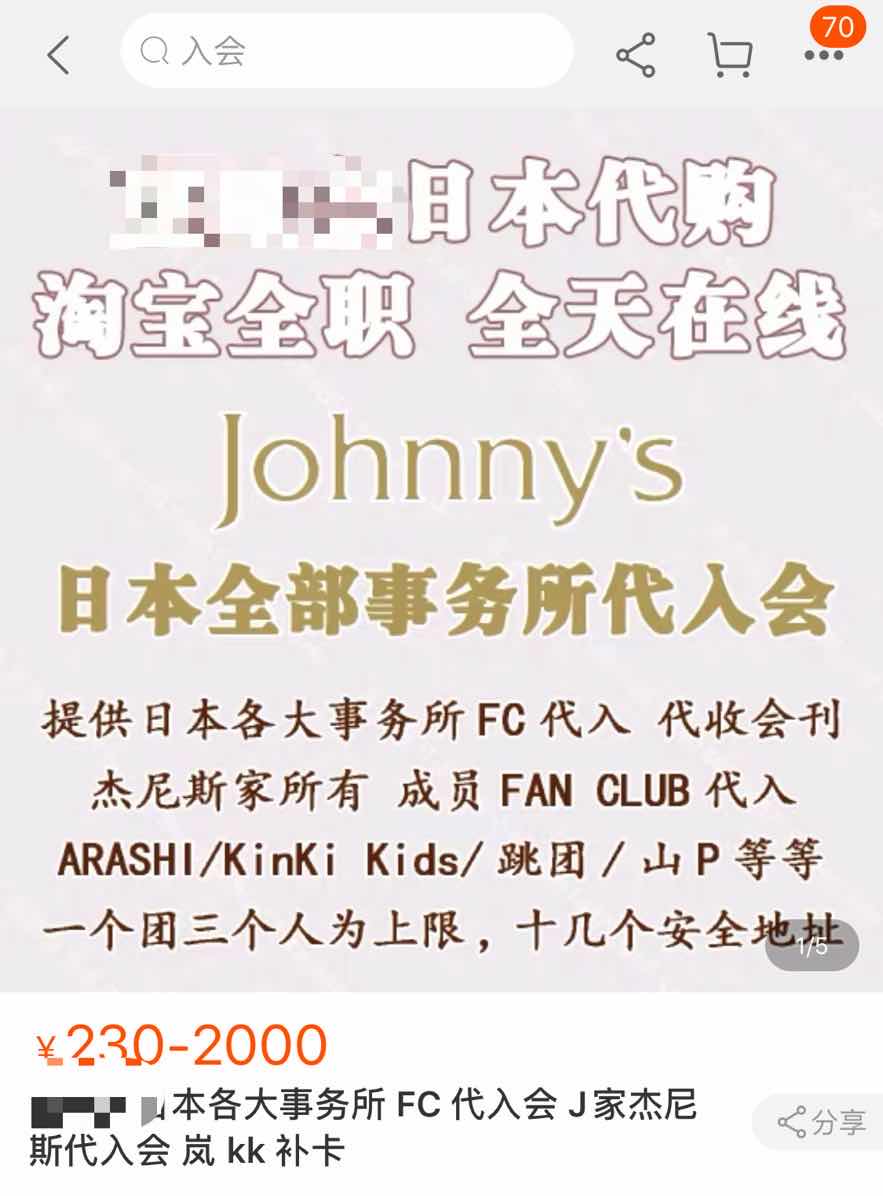 为了保护旗下艺人的网络肖像权,杰尼斯多是通过线下邮寄的方式给粉丝传达福利。注册杰尼斯FC时,除了5000日元(折合人民币约329元)的基本费用,一个必需的条件是有效的日本地址。一旦成为会员,杰尼斯就会向这个地址投递会员卡、卡套、会册。国外粉丝如果想要加入FC,就得租地址或者代入会。淘宝上就有提供杰尼斯FC代入会的服务,根据所饭团体的热门程度,价格从1000至2000元上下浮动不等。