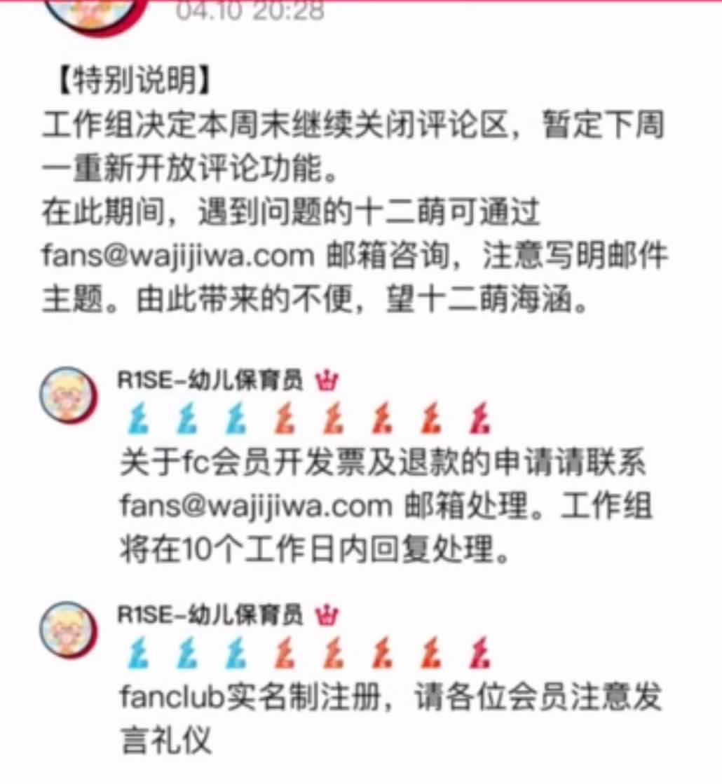4月13日,R1SE官方FC@R1SE-幼儿保育员再次发布公告:“fanclub实名制注册,请各位会员注意发言礼仪。”豆瓣用户@已注销质疑道:“就算骂几句哇唧唧哇,难道还要泄露用户信息人肉用户吗?又不是政治立场、反社会的言论,凭什么?”