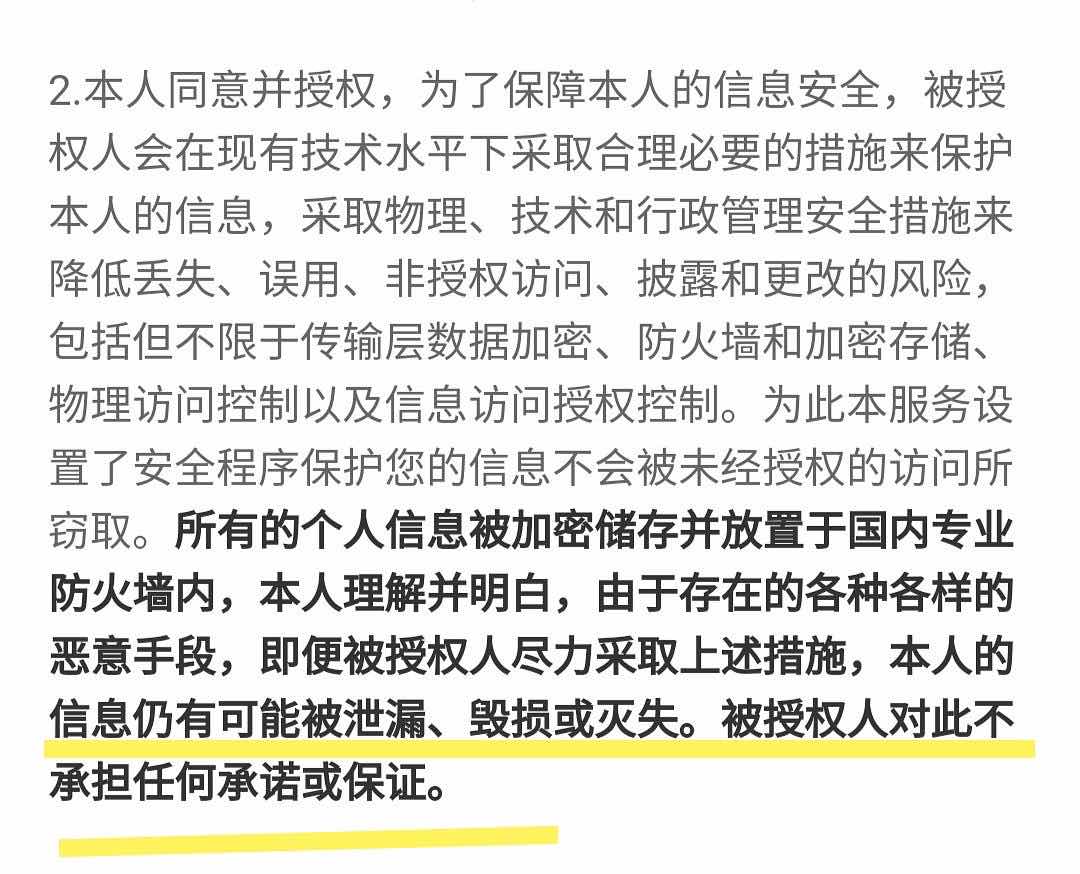 “即使被授权人尽力采取上述(保护)措施,本人的信息仍有可能被泄漏、毁损或灭失。被授权人对此不承担任何承诺或保证。”