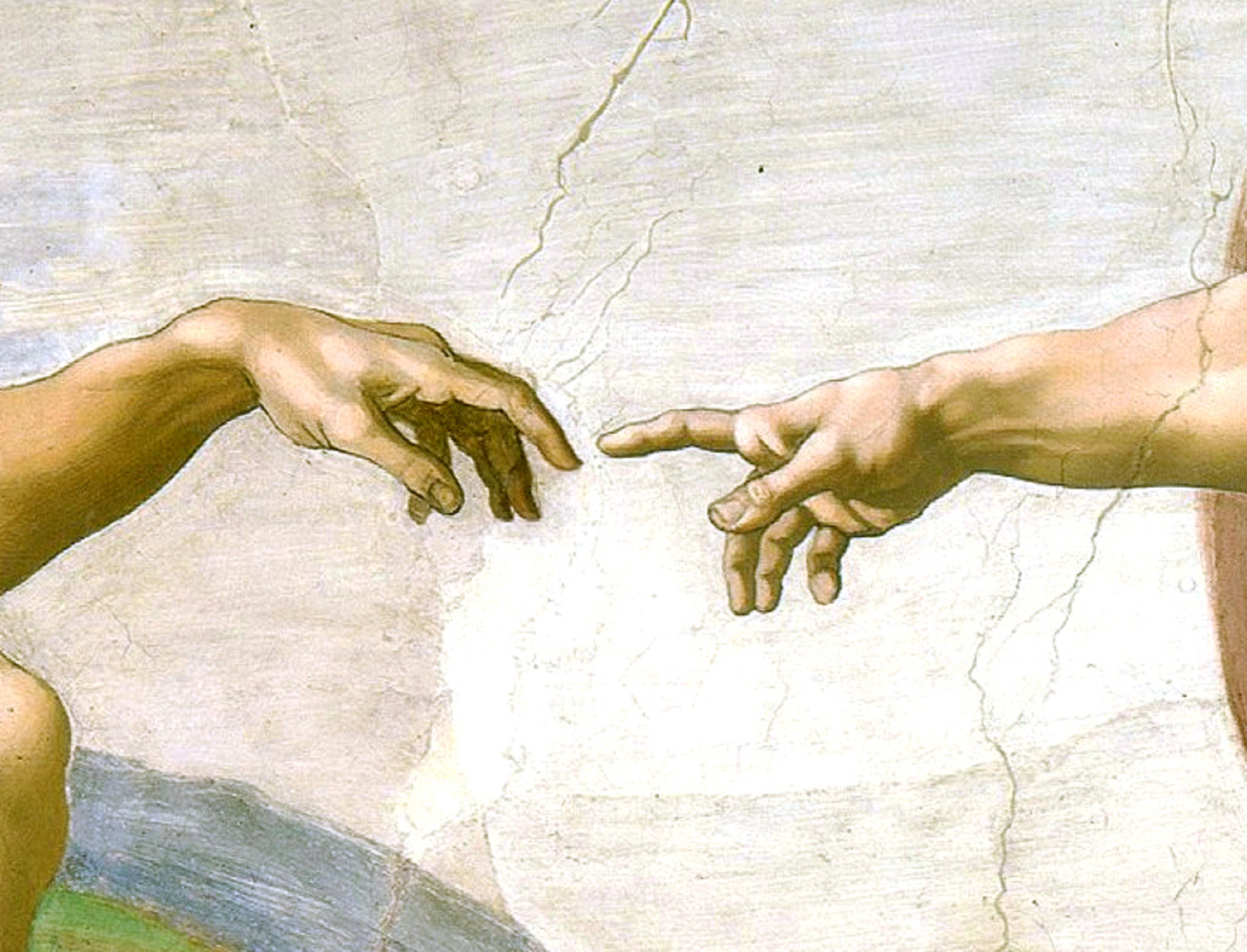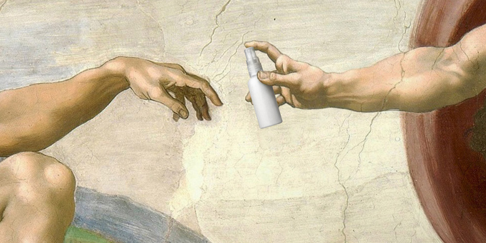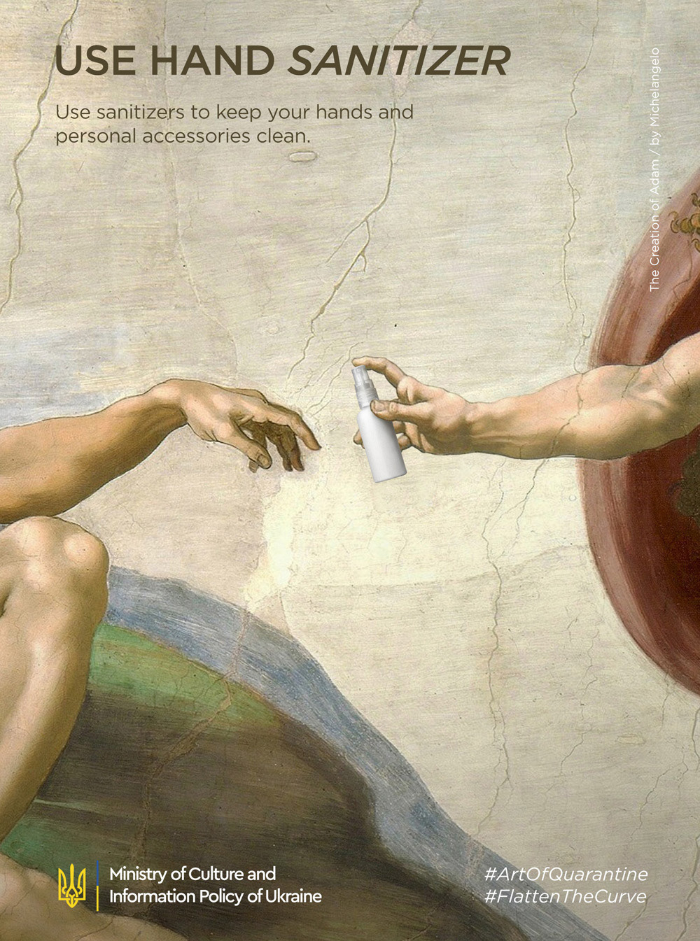 米开朗基罗《创造亚当》。充满关怀的上帝之手,这次为亚当带来了消毒液。