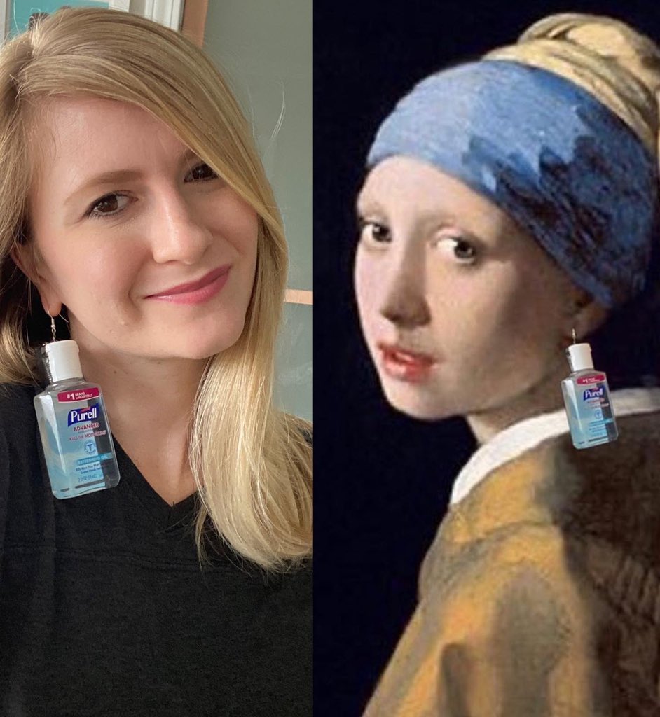 因为消毒洗手液在当下成了抢手货,洛杉矶喜剧作家Deanna Director戏称,洗手液才是2020年高端奢侈品。她在推特上发布了一张戴洗手液耳坠的照片,开玩笑说:我才是戴珍珠耳环的女孩。电影《戴珍珠耳环的女孩》的导演彼得·韦伯积极转发了这条消息。