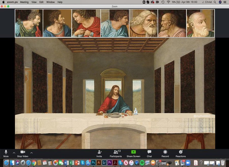 网友MythAddict在推特上发布了一个在家办公版的《最后的晚餐》。图中,门徒通过Zoom会议和耶稣进行会面。