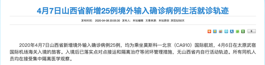 俄罗斯疫情爆发后,中国率先接受了来自俄罗斯的境外输入压力。俄航 SU208 并非个例。4 月 6 日,中国国际航空公司由莫斯科飞往北京航班 CA190,经太原武宿国际机场海关入境,其中 28 名乘客被确诊感染新冠病毒。
