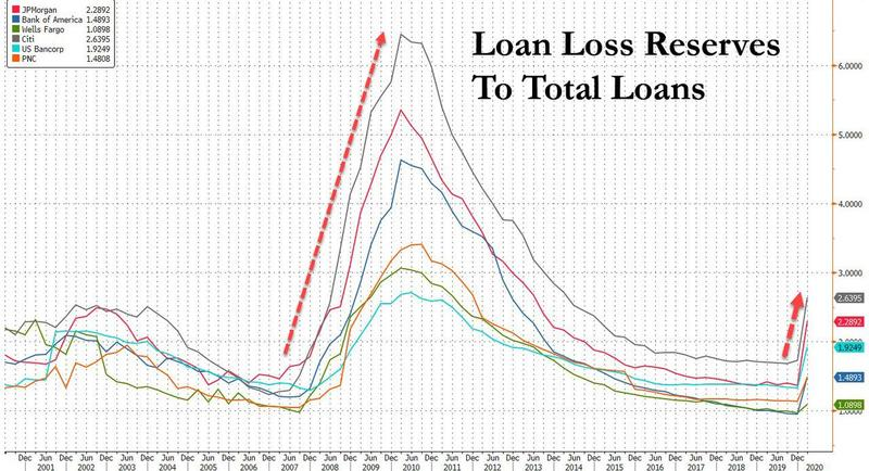 原因在于,由于担心经济停摆带来的坏账猛增,一季度摩根大通、摩根士丹利(Morgan Stanley)、花旗、高盛等在内的全美七大银行未雨绸缪,坏账拨备达到了270亿美元,比去年同期多四倍。摩根大通——这家美国最大的银行的累计拨备金已经与2009年全球金融危机最严重时拨备的数额相符。