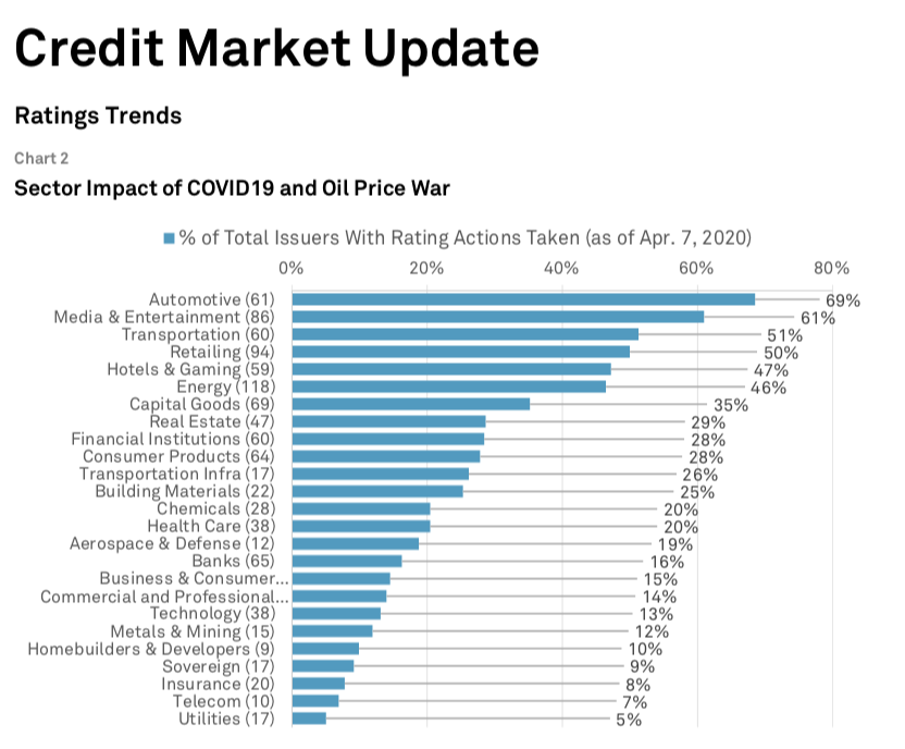 路透社称,美国企业将迎接“可能是金融危机以来最黯淡的财报季”。研究机构LPL表示,10%的下滑还是最乐观的预测,很有可能达到15%-20%的平均下滑幅度。据中证报援引标普报告,该机构已经对全球1000多家企业采取负面评级行动(包括下调评级和展望负面等)。从行业来看,汽车业、传媒娱乐业、交通运输业、零售业、酒店博彩业、能源业等首当其冲。这些行业可能成为违约高发行业。