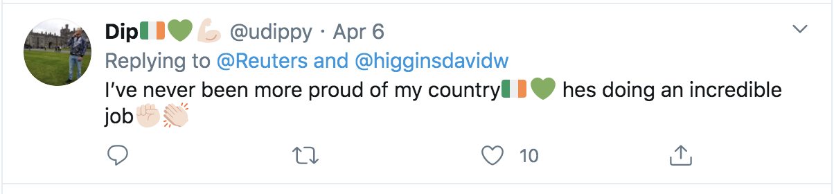 “爱尔兰是个伟大的国家,我们的国民是伟大的人。我们过去经历过困难和斗争,并用决心和意志战胜了许多考验。这次我们也会胜利。”他在讲话中说。